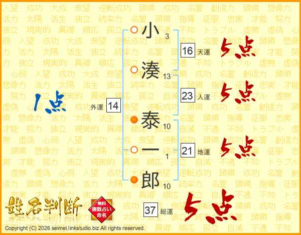 小(3画)湊(13画) 泰(10画)一(1画)郎(10画)