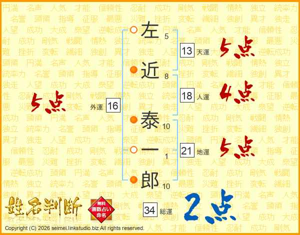 左(5画)近(8画) 泰(10画)一(1画)郎(10画)