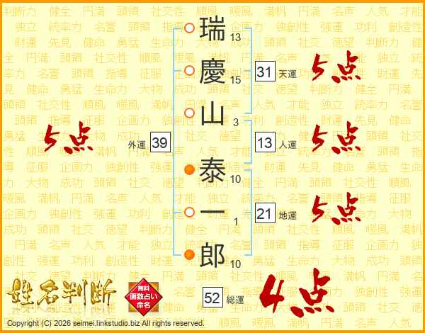 瑞(13画)慶(15画)山(3画) 泰(10画)一(1画)郎(10画)