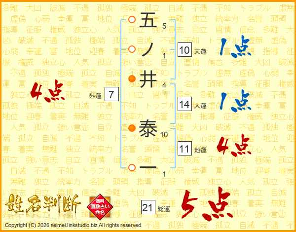 五ノ井泰一さんの総運は21画の5点!