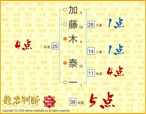 加(5画)藤(19画)木(4画) 泰(10画)一(1画)