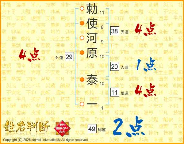 勅(11画)使(8画)河(9画)原(10画) 泰(10画)一(1画)