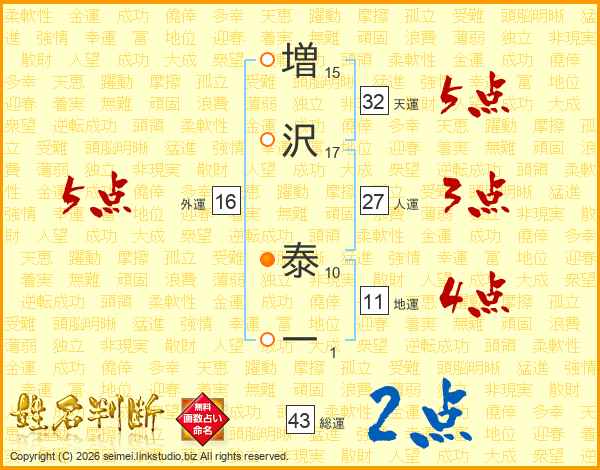 増(15画)沢(17画) 泰(10画)一(1画)