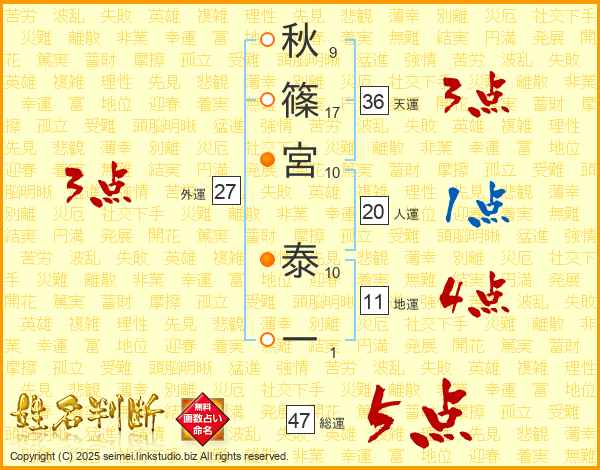 秋(9画)篠(17画)宮(10画) 泰(10画)一(1画)