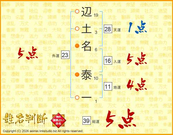 辺(19画)土(3画)名(6画) 泰(10画)一(1画)