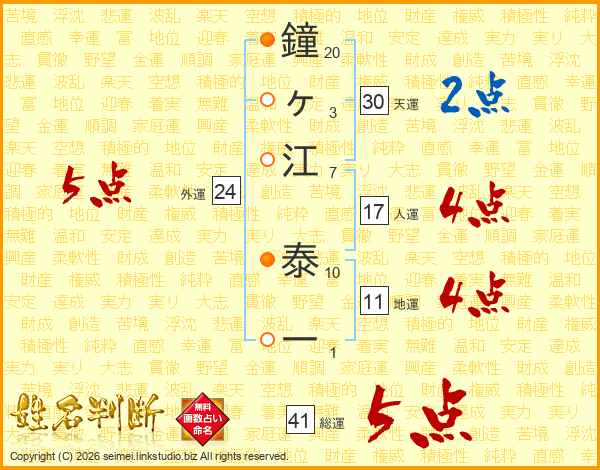 鐘(20画)ヶ(3画)江(7画) 泰(10画)一(1画)