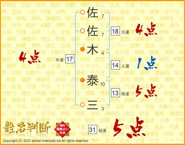 佐(7画)佐(7画)木(4画) 泰(10画)三(3画)