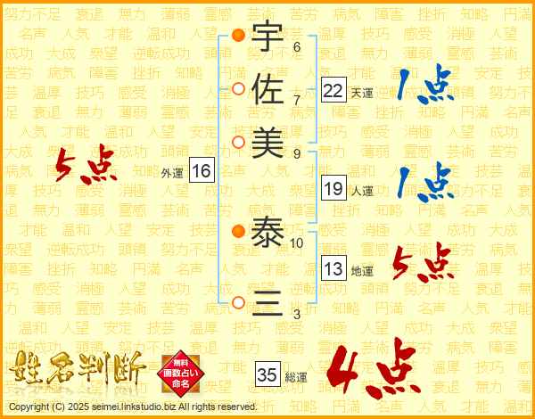 宇(6画)佐(7画)美(9画) 泰(10画)三(3画)