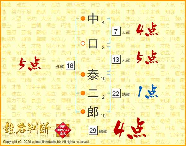 中(4画)口(3画) 泰(10画)二(2画)郎(10画)