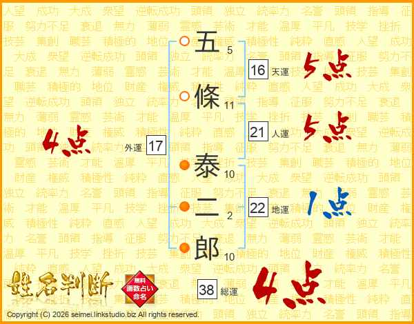 五(5画)條(11画) 泰(10画)二(2画)郎(10画)