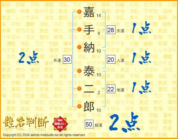 嘉(14画)手(4画)納(10画) 泰(10画)二(2画)郎(10画)