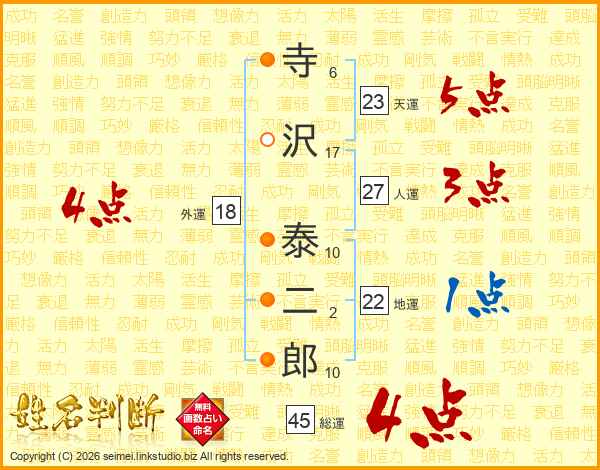 寺沢泰二郎さんの総運は45画の4点!