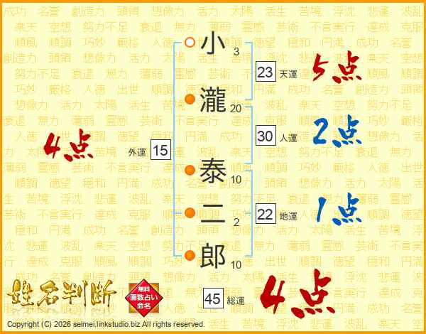 小(3画)瀧(20画) 泰(10画)二(2画)郎(10画)