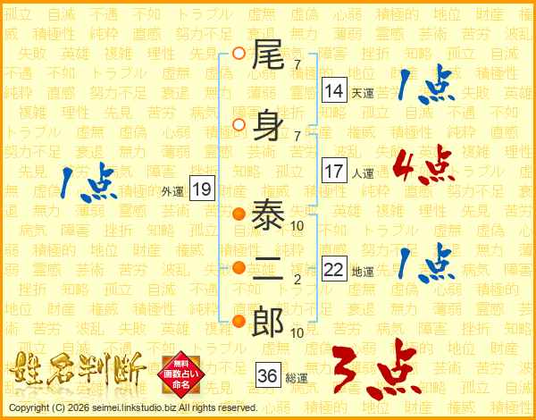 尾(7画)身(7画) 泰(10画)二(2画)郎(10画)