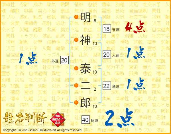 明(8画)神(10画) 泰(10画)二(2画)郎(10画)