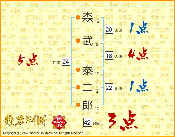 森(12画)武(8画) 泰(10画)二(2画)郎(10画)