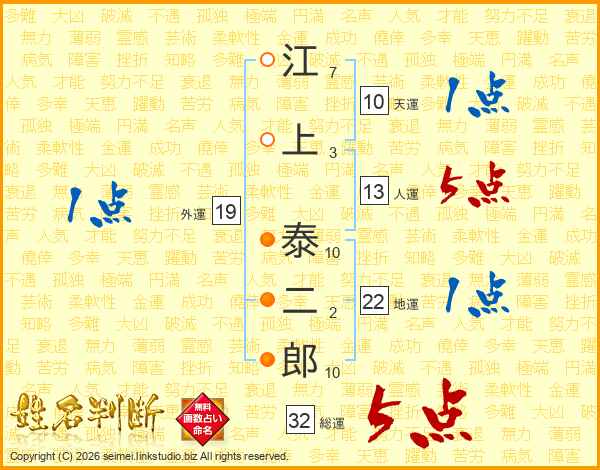 江(7画)上(3画) 泰(10画)二(2画)郎(10画)