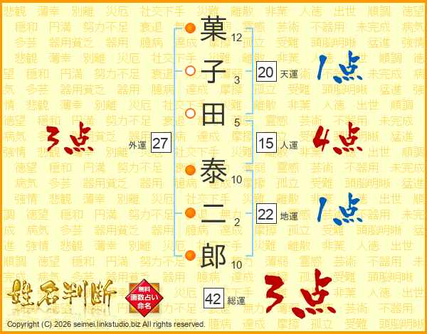 菓(12画)子(3画)田(5画) 泰(10画)二(2画)郎(10画)