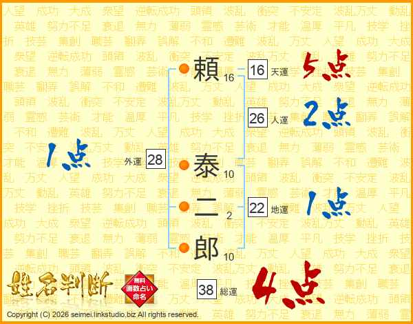 頼(16画) 泰(10画)二(2画)郎(10画)