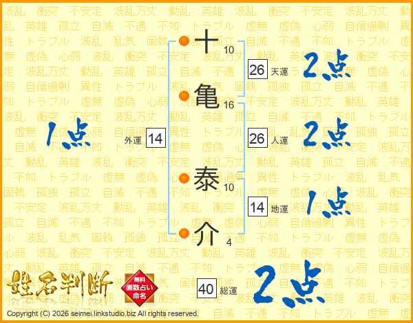 生活面を象徴する運勢です。外部から受ける影響力を表し、結婚運、家庭運や職場、環境への順応性を表します。総運から人運を引いた画数。姓や名が1文字の場合を除く。