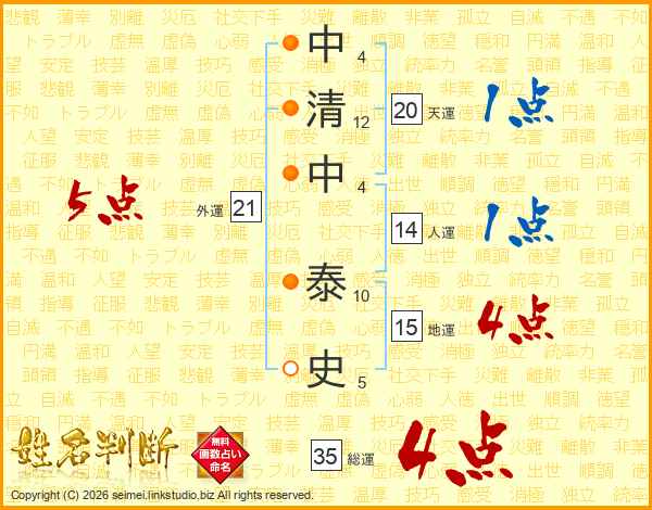 中(4画)清(12画)中(4画) 泰(10画)史(5画)