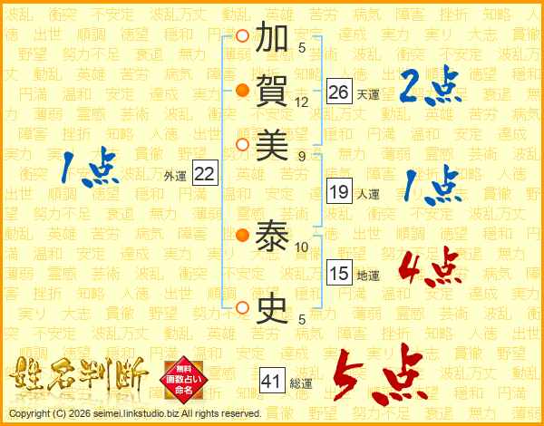 加(5画)賀(12画)美(9画) 泰(10画)史(5画)