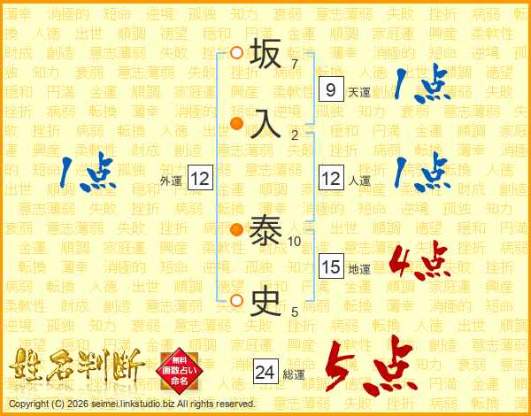 坂(7画)入(2画) 泰(10画)史(5画)