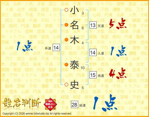 小(3画)名(6画)木(4画) 泰(10画)史(5画)