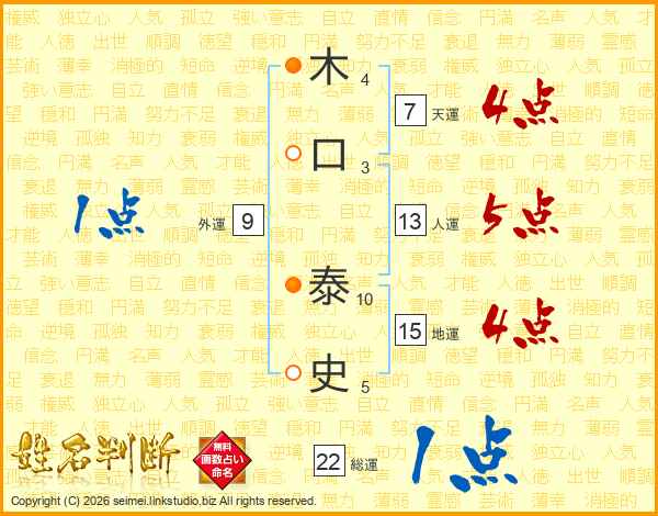 木(4画)口(3画) 泰(10画)史(5画)