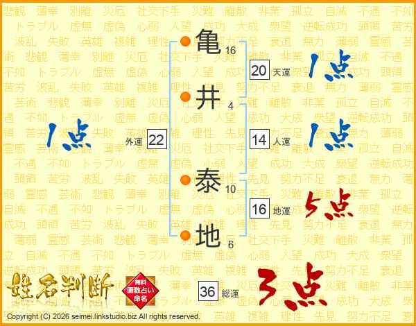 亀(16画)井(4画) 泰(10画)地(6画)