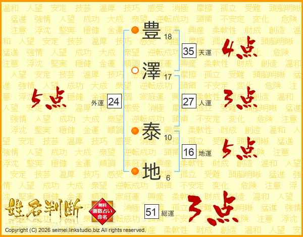 豊(18画)澤(17画) 泰(10画)地(6画)