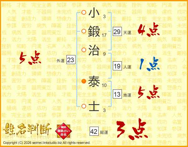 小(3画)鍛(17画)治(9画) 泰(10画)士(3画)