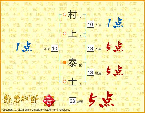 村上泰士さんの総運は23画の5点!