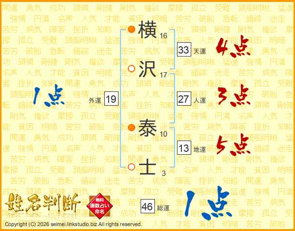 横沢泰士さんの天運は33画の4点!