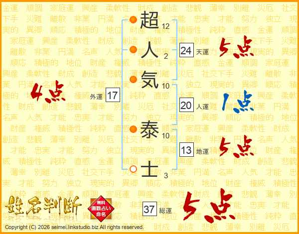 超(12画)人(2画)気(10画) 泰(10画)士(3画)