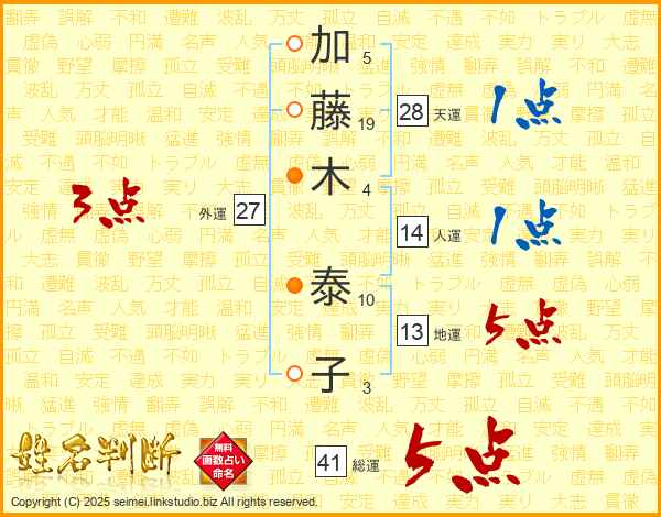 加藤木泰子さんの総運は41画の5点!