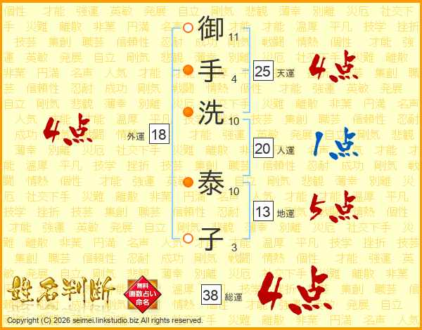 御(11画)手(4画)洗(10画) 泰(10画)子(3画)
