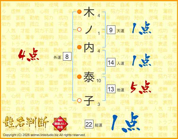 木(4画)ノ(1画)内(4画) 泰(10画)子(3画)