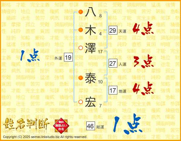 八(8画)木(4画)澤(17画) 泰(10画)宏(7画)