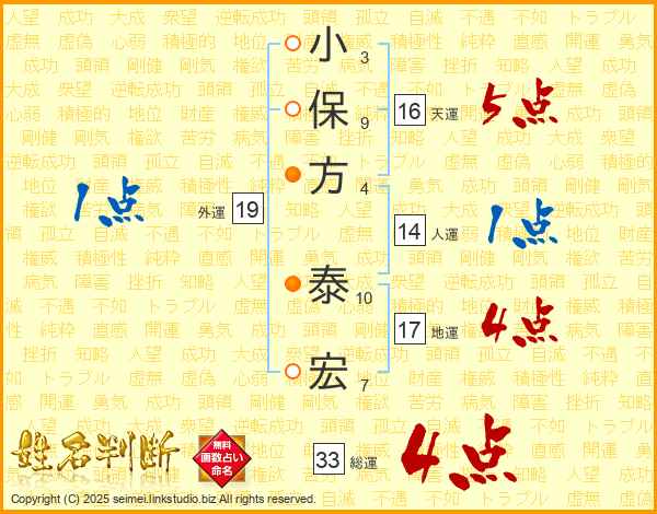 小(3画)保(9画)方(4画) 泰(10画)宏(7画)