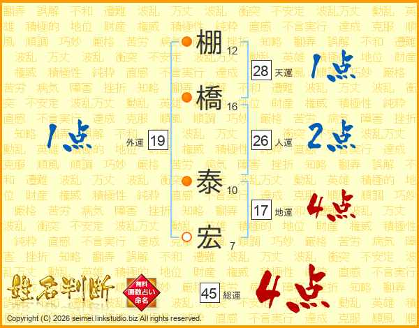 棚(12画)橋(16画) 泰(10画)宏(7画)