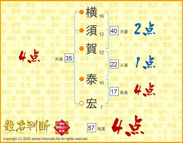 横須賀泰宏さんの総運は57画の4点!