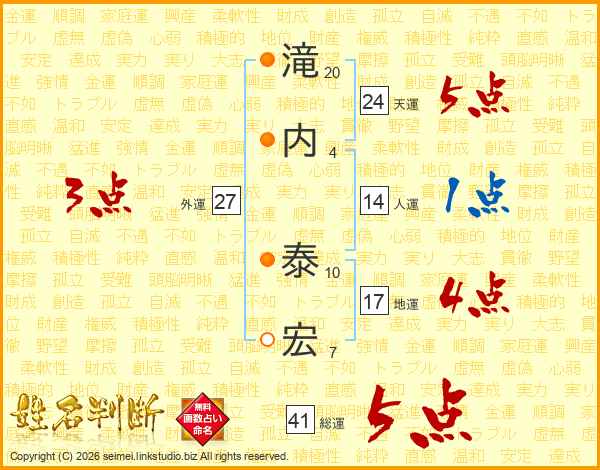 滝(20画)内(4画) 泰(10画)宏(7画)