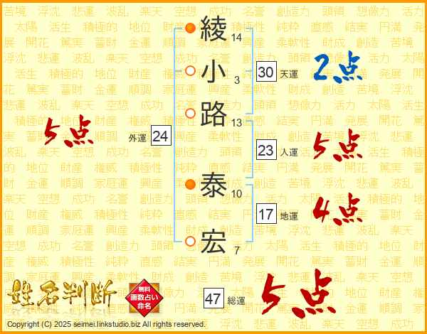 綾小路泰宏さんの総運は47画の5点!