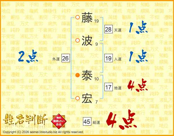 藤(19画)波(9画) 泰(10画)宏(7画)