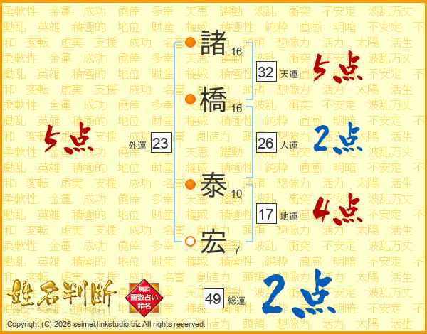 諸(16画)橋(16画) 泰(10画)宏(7画)