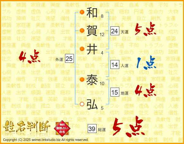 和(8画)賀(12画)井(4画) 泰(10画)弘(5画)