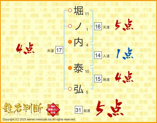 堀ノ内泰弘さんの総運は31画の5点!
