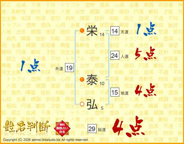 生活面を象徴する運勢です。外部から受ける影響力を表し、結婚運、家庭運や職場、環境への順応性を表します。総運から人運を引いた画数。姓や名が1文字の場合を除く。