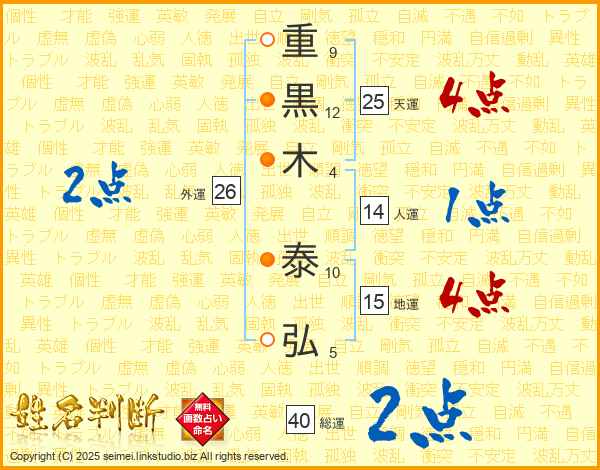 重(9画)黒(12画)木(4画) 泰(10画)弘(5画)